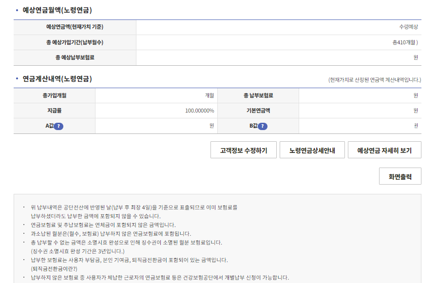 ⑥ 예상연금월액 월 수령예상 금액과, 수령받는 날까지 총 예상납부 보혐료가 출력됩니다.