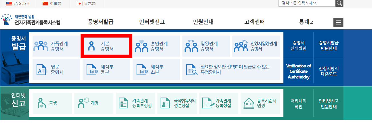 📍 가족관계증명서에 있는 직계가족에 한정하여 대리 신청도 가능합니다.(위임장, 신분증 사본, 기본증명서 필요)