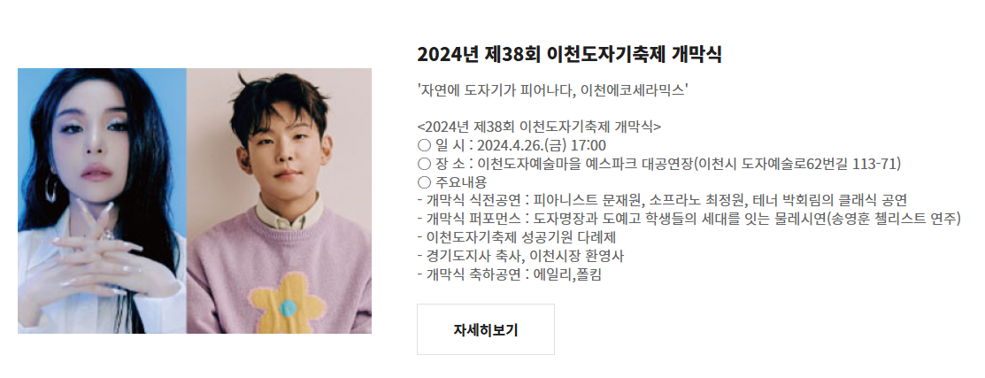 2025년 봄, 단 하나의 축제를 꼽아야 한다면 단연 이천도자기축제입니다. 특별한 개막식 라인업과 놓치면 후회할 프로그램들이 가득!🎶